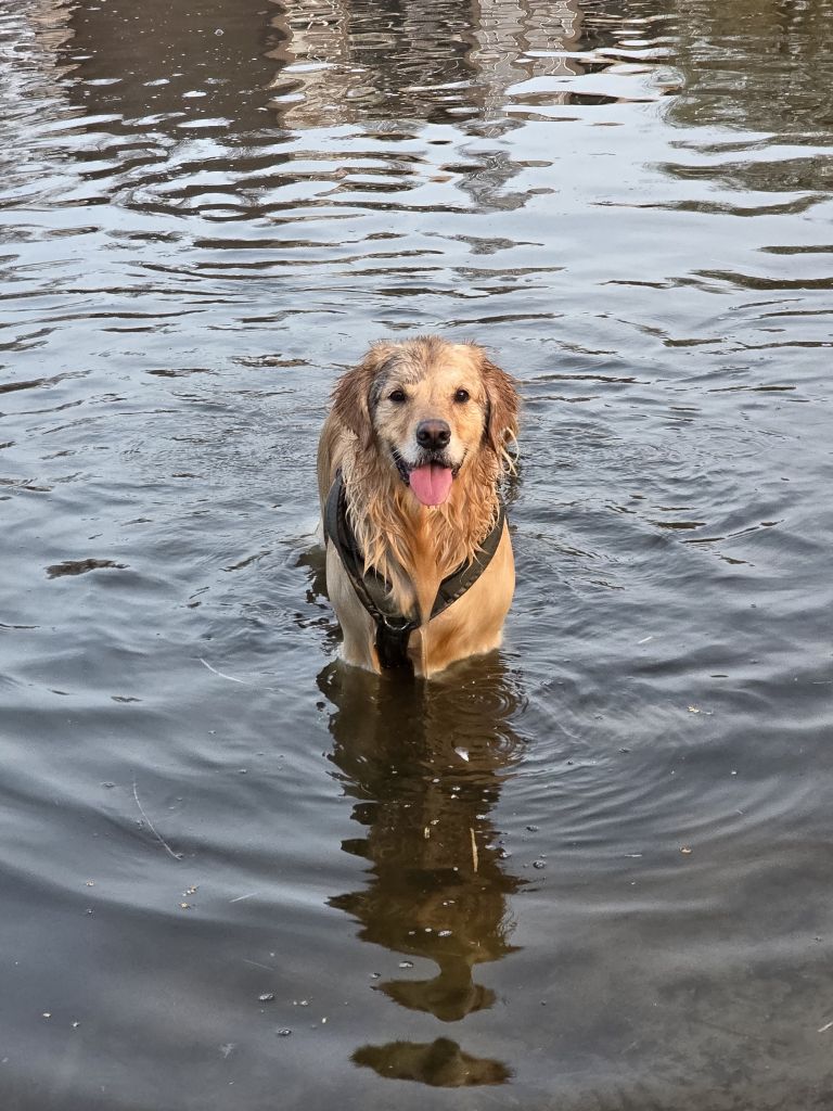 Hij luisterd los beter dan aan de lijn. En zoals bijna iedere golden is hij gek op zwemmen! Als hij los is, is hij vriendelijk naar andere honden. Aan de lijn liever geen face to face ontmoetingen met andere honden. Hij is clickergetraind. Hij is sterk gefocussed op mij, dus als we in t begin een paar keer samen kunnen lopen zodat hij ook beter aan jou kan wennen waar ik bij ben zou heel fijn zijn.