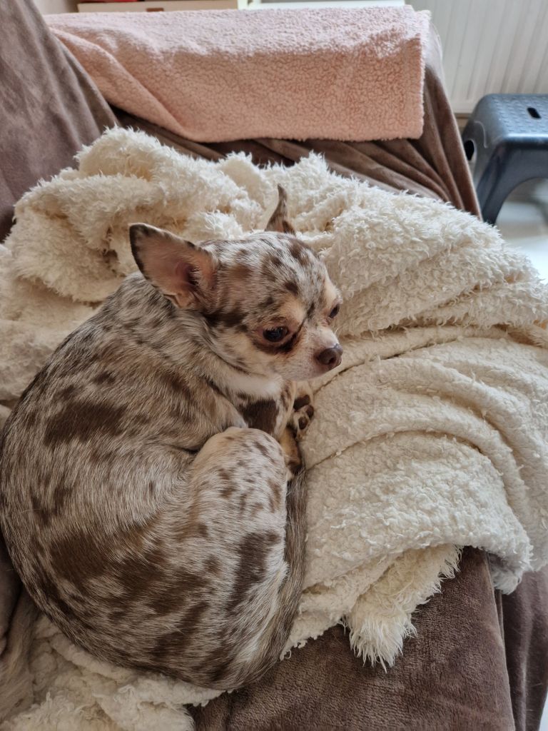 Dan nog Sky chihuahua van 8 jaar oud reu gecastreerd en is lief kan heel soms pittig zijn.
