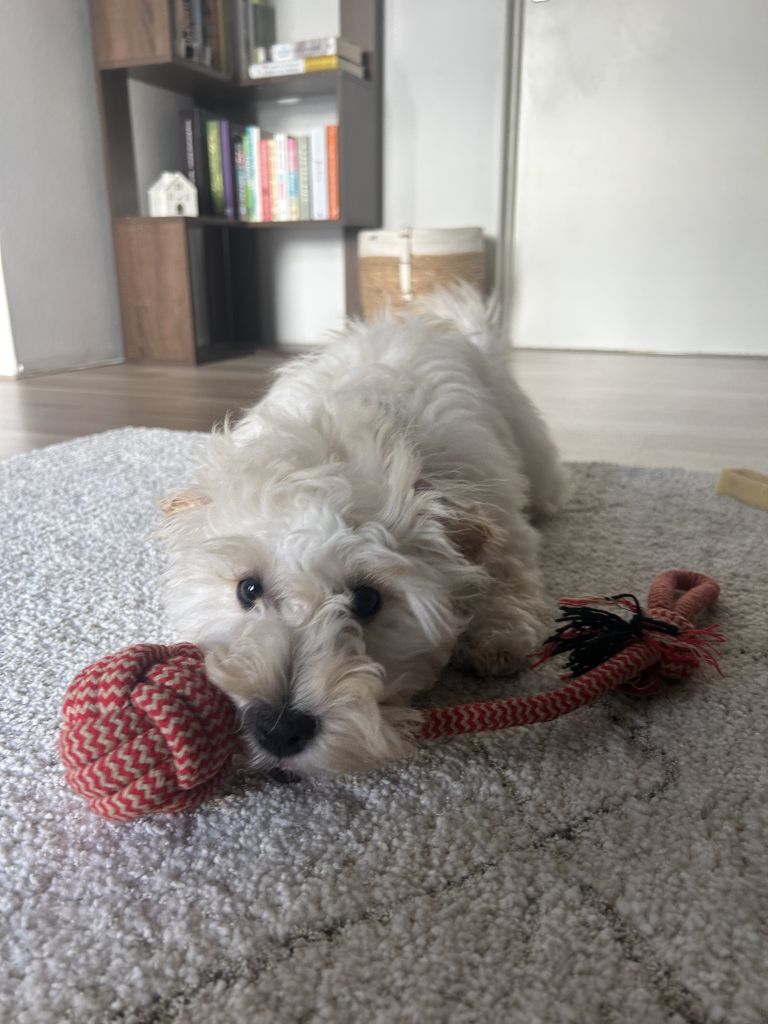 We zijn bezig hem stap voor stap wat zelfstandigheid te leren, maar hij is nog te jong om langere tijd alleen te blijven. Ook werkt hij nog aan zijn zindelijkheid; dankzij de puppyren gaat dit gelukkig al steeds beter.