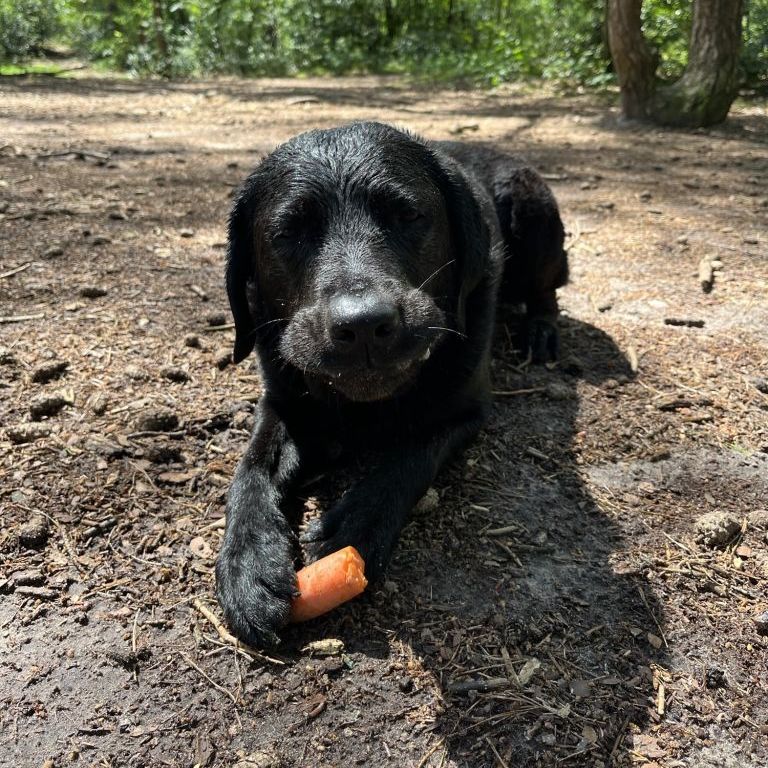 Charlie kan goed met kinderen en andere honden (neutraal-voorzichtig met katten). Buiten heeft ze weinig interesse in andere honden. Binnen is ze erg rustig, blaft vrijwel nooit, slaapt, knuffelt en achtervolgt je graag 😉. Het is wel een echte labrador: ze is bezeten van eten!