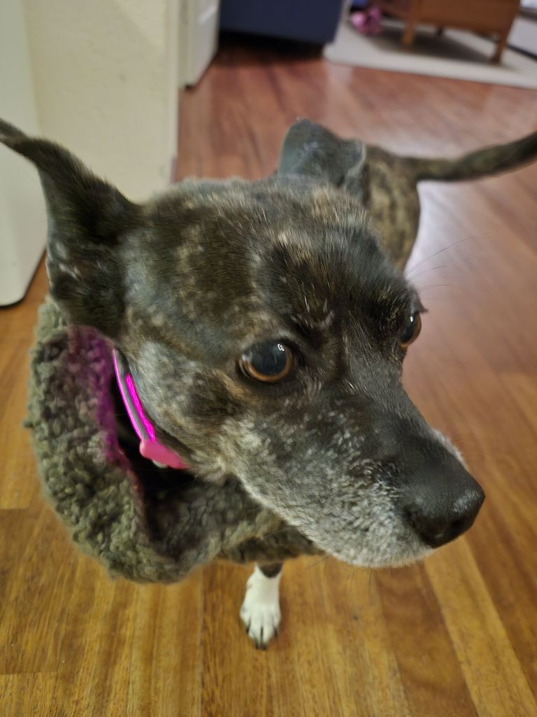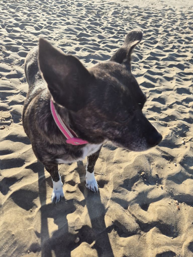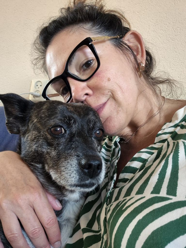 Ze is zeer flexibel en aanpasbaar. Ze houdt van wandelingen en de tijd nemen om te snuffelen — maar wees voorzichtig, ze houdt ook van het eten van kattenpoep. 🙂 Ze vindt het geweldig om zonder riem te wandelen, vooral in het bos, maar niet bij verkeer, enzovoort.