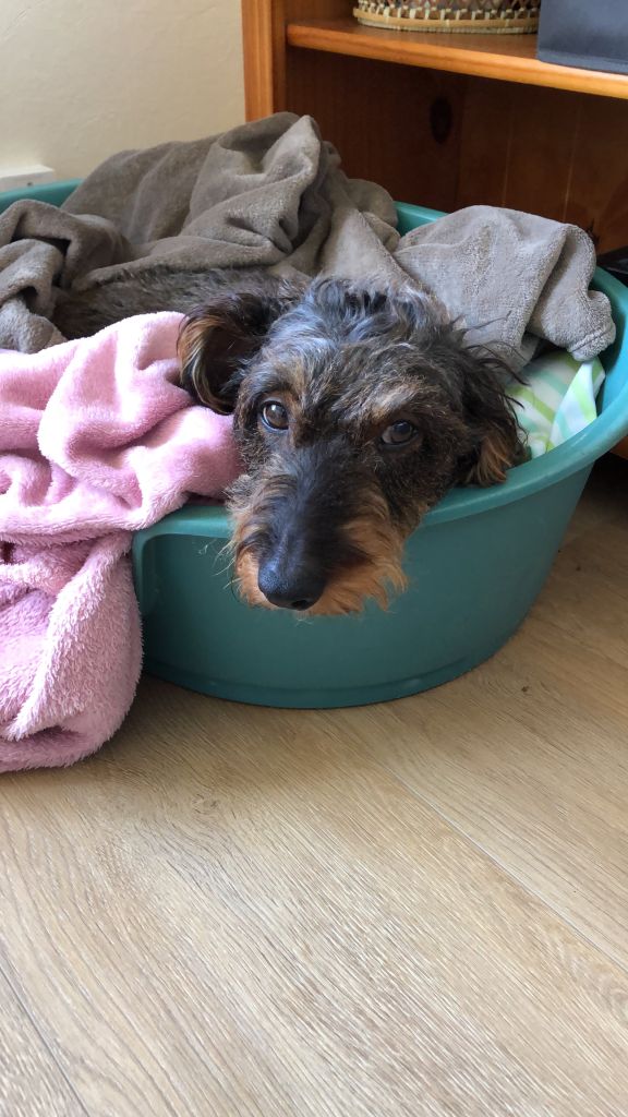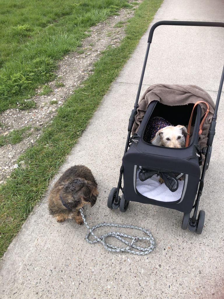 Op dit moment heb ik 2 hondjes. De donkere is 8 jaar en heet Guusje. Het andere hondje is Fleurtje en is 15 jaar oud. Door omstandigheden zijn beide hondjes niet sociaal met andere honden en uit angst zoeken ze altijd ruzie met andere honden helaas. In huis zijn ze prima, lief en vernielen niets. Beide hondjes zijn waaks en blaffen dan. Omdat we nog maar kort op dit adres wonen zijn ze nog niet helemaal gewend om langer dan 1 uur alleen te zijn. Om die reden zoek ik dus een oppas. Er zijn momenten dat ik langer dan een uur afwezig ben en meenemen is niet altijd een mogelijkheid. In de winter bleven ze ook weleens in de auto maar met de stijgende temperaturen is dat niet aan de orde. Beide hondjes zijn gesteriliseerde teefjes . Door de leeftijd van Fleurtje pas ik tempo en afstand aan tijdens het uitlaten. Om Guusje toch haar beweging te geven is het karretje de oplossing. Fleurtje er in en Guusje ernaast. Soms blijft Fleurtje ook wel eens gewoon thuis terwijl ik met Guusje ga lopen.