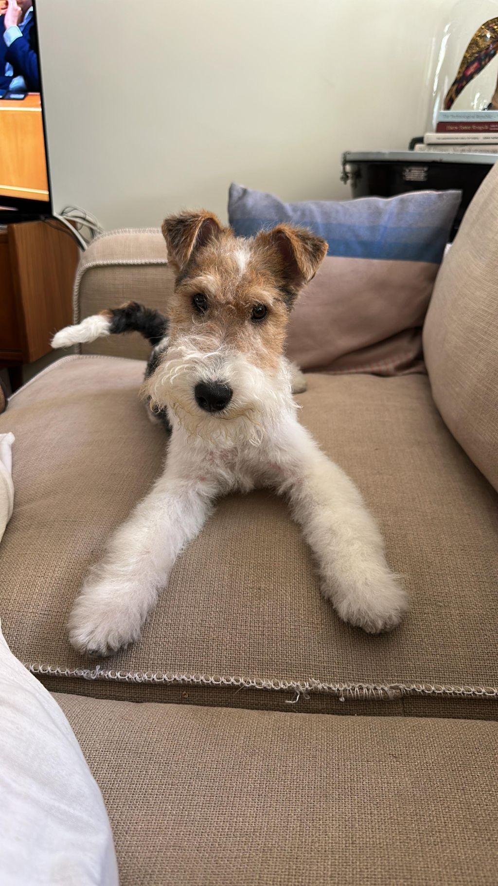 Jacques (bijnamen Sjakie of Sjakkie) is een ontzettend vrolijk hondje die gek op mensen is en in huis het liefst tegen je aan komt zitten. Hij vindt niets gezelliger! Buiten is hij nieuwsgierig naar andere hondjes en loopt graag een rondje. Zijn enthousiasme maakt dat hij wel eens aan de riem wil trekken, maar met zijn 8 kilo kan hij weinig uithalen. We zijn dan ook streng als hij dat doet, en het commando 'naast' met een snoepje werkt goed om hem naast je te laten lopen.