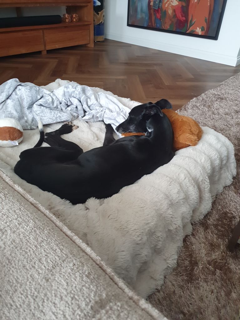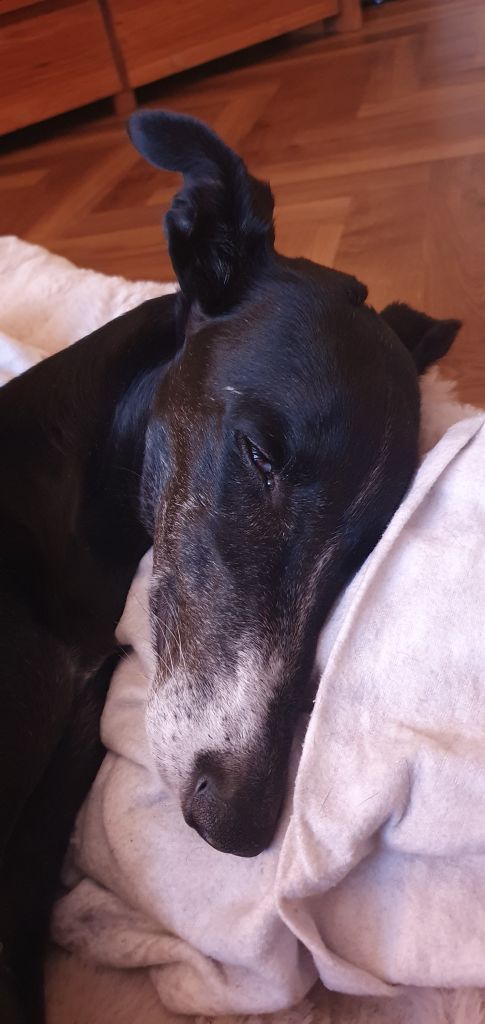 Jana is een Spaanse Galgo, we hebben haar geadopteerd uit een asiel in Spanje. Ze is een ontzettend lief en rustig meisje. Loopt perfect mee met de leiband, wandelen doet ze graag, maar slapen ook in haar heerlijke mand.