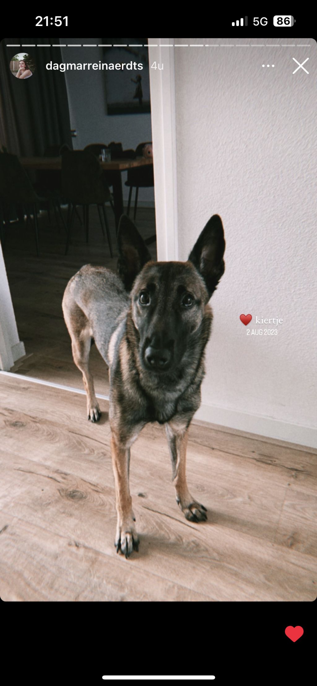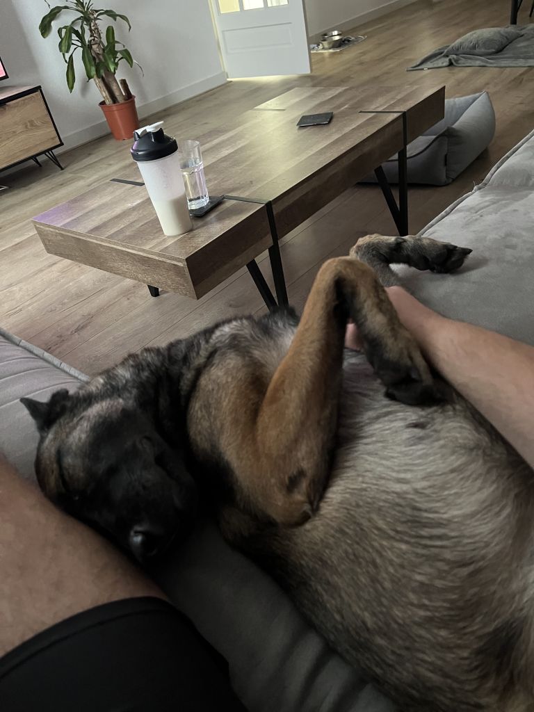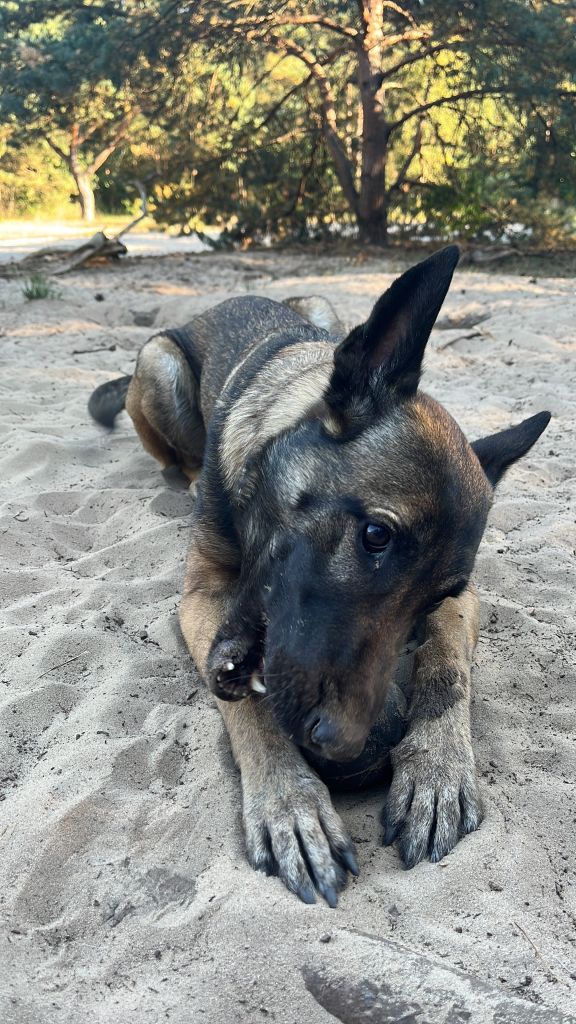 Dit is Kira! Een hele lieve mechelse herder teefje. Kira is zo speels als maar zijn kan maar ze vind het ook heerlijk om op de bank met je te knuffelen. Kira kan ook erg goed met andere honden. Alleen katten vindt ze wat minder (en fatbikers)