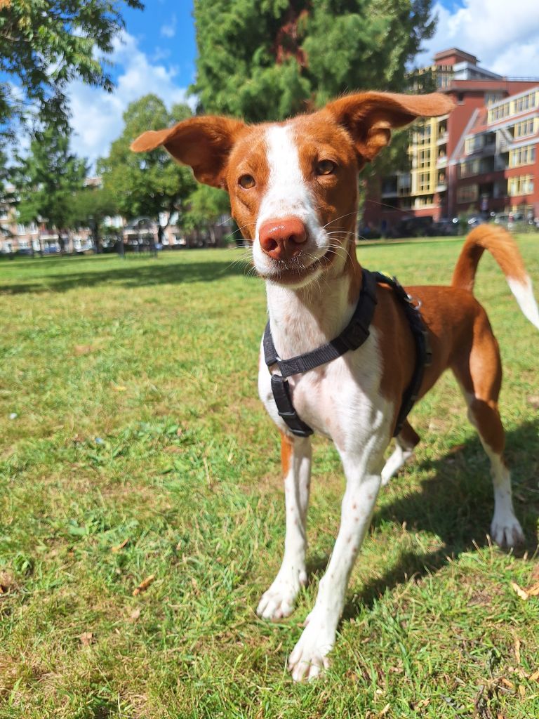 Ze speelt leuk met andere honden, komt altijd netjes terug en luistert goed, al kan ze ook flink koppig zijn en soms wat hyper/overprikkeld.