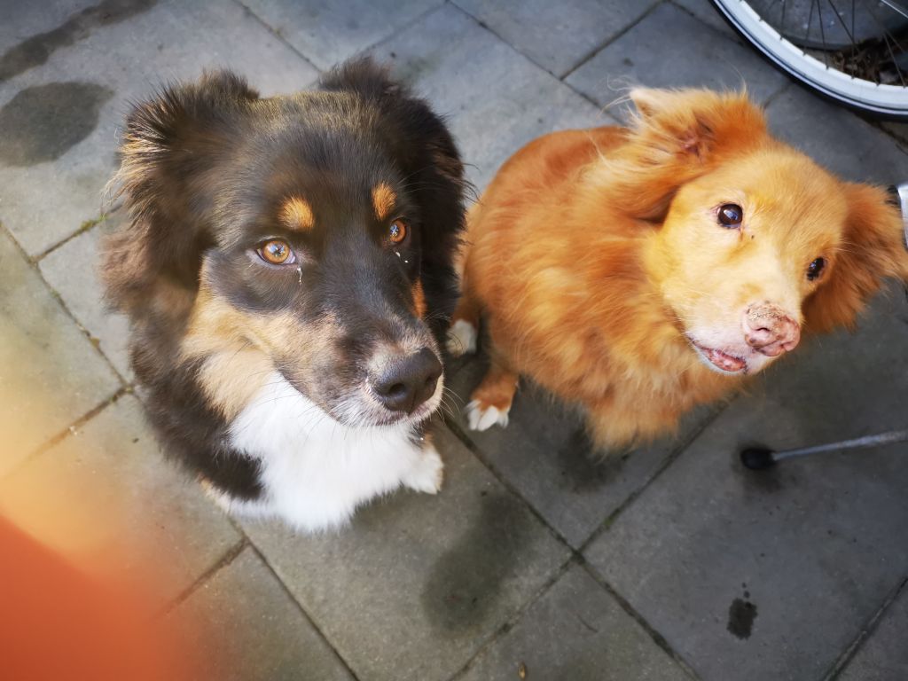 We hebben twee honden, Nikki is een lieve, rustige Toller retriever van 13. Ze kan in het begin wat eenkennig zijn, maar als ze even heeft mogen snuffelen dan is het al snel goed. En Mayla is een lieve, speelse, energieke Australian Shepherd van bijna 11 maanden die graag geknuffeld wordt. Ze is soms wat aan het puberen en als ze losoopt kan ze zo opgaan in het spelen met een andere hond dat het moeilijk is om te luisteren.