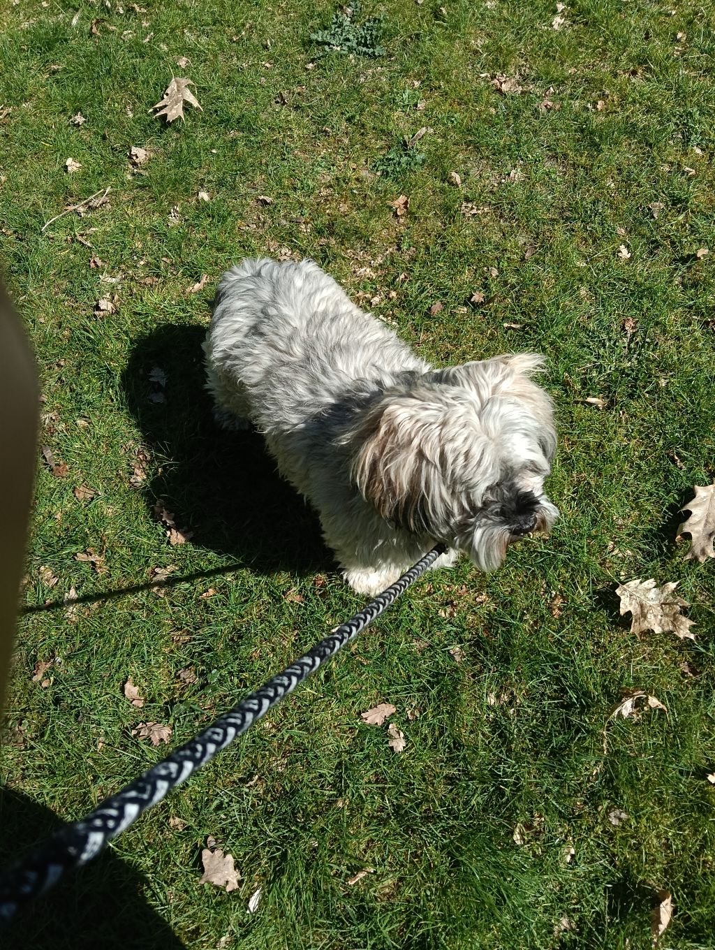 Hij kan flink aan de lijn trekken, ik heb nu een anti-trektuigje gekocht om dat een beetje te voorkomen, maar aangezien hij nieuw is bij ons, moeten we dat nog afleren.
