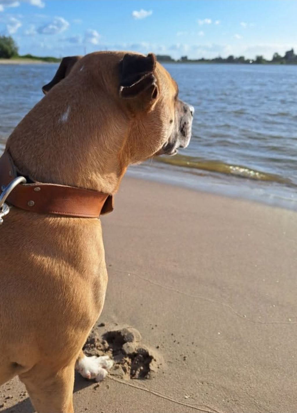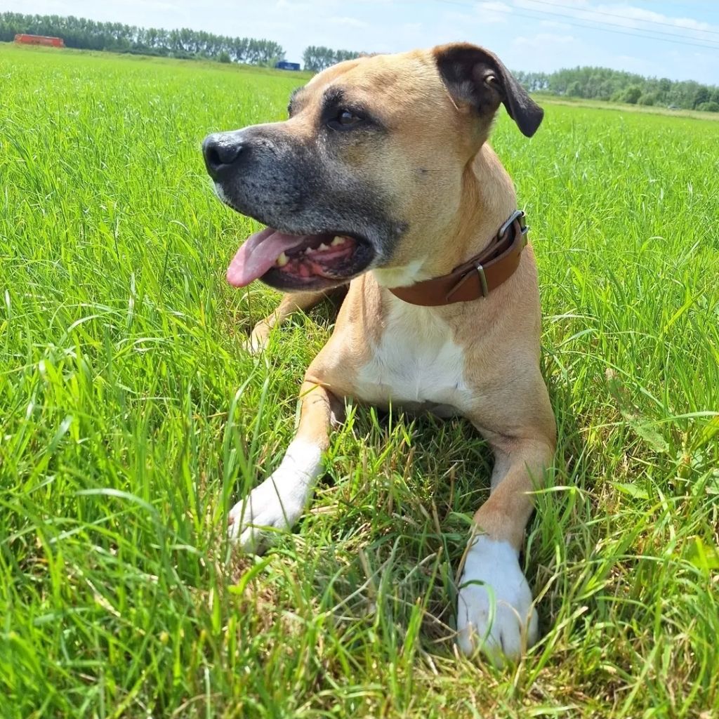 Muppet is een 7-jarige Amerikaanse Staffordshire Terrier. In maart 2025 hebben wij Muppet geadopteerd uit het dierenasiel. Helaas heeft hij in het verleden geen makkelijke tijd gehad. Toen we hem ophaalden was hij veel te mager. Door goede voeding, veel wandelen en natuurlijk veel aandacht en liefde heeft hij inmiddels weer een gezond gewicht en geniet hij zichtbaar van het leven.
