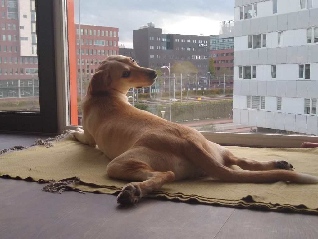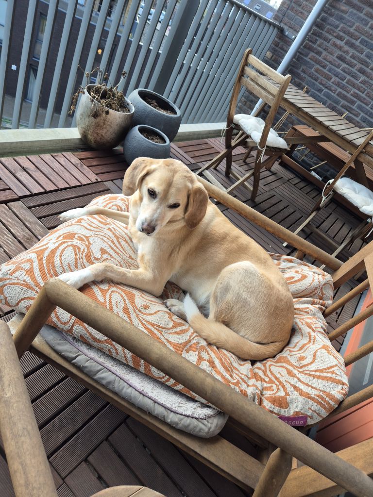 Noga is vanuit Roemenie bij ons gekomen toen hij 6 maanden oud was en vanaf dat moment écht ons huisgenootje. Het is geen knuffelhond (maar onder zn kind of achter zn oren kriebelen vindt hij erg lekker), maar hij wil altijd daar zijn waar jij ook bent. Hij is rustig, slaapt de het liefst de hele dag aan je voeten, maar als je aanstalte maakt om naar buiten te gaan, staat hij in de startblokken.