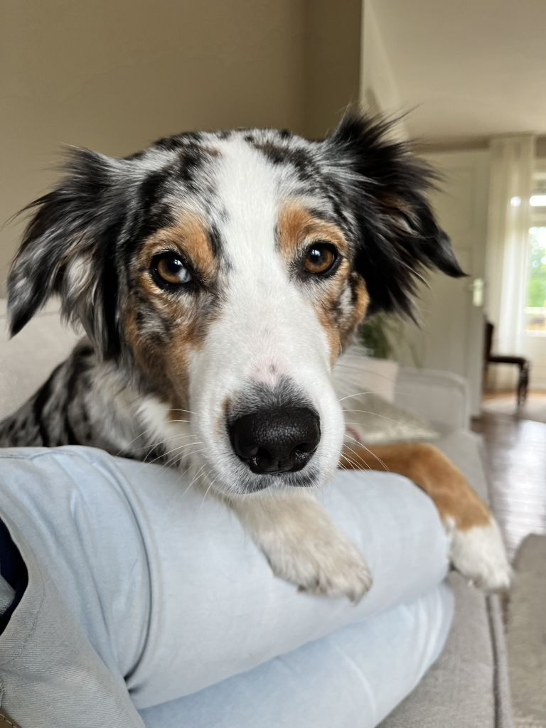 Phine is een energieke, intelligente en gevoelige hond. Een leuke bijkomstigheid, er gaat geen wandeling voorbij of je hoort ‘wat een mooie hond’. Ze kan goed samen met andere honden, katten en kinderen van heel jong (baby) tot oud(er). Ze kan wel eigenwijs zijn en soms wat reactief naar bepaalde honden en vraagt een consequent baasje. Phine houdt van wandelen, knuffelen, samen spelen, denkspelletjes, agility en circuitachtige activiteiten of samen hardlopen in het bos. Ook ligt ze graag aan je voeten of tegen je aan op de bank. Dat laatste natuurlijk alleen indien dat voor jou wenselijk is. Wegens gezondheidsklachten