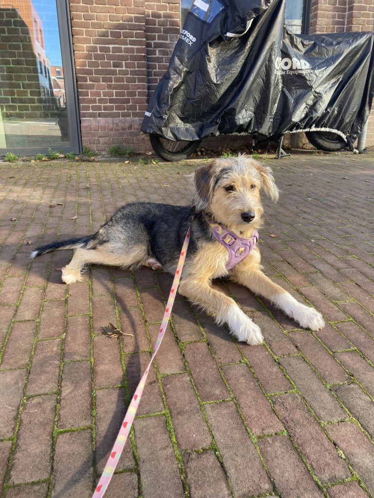 Hi, ik ben Pizza! Ongeveer 1 jaar oud. Ik hou van lange wandelingen en korte wandelingen. Ik ga goed om met andere honden, kinderen en katten