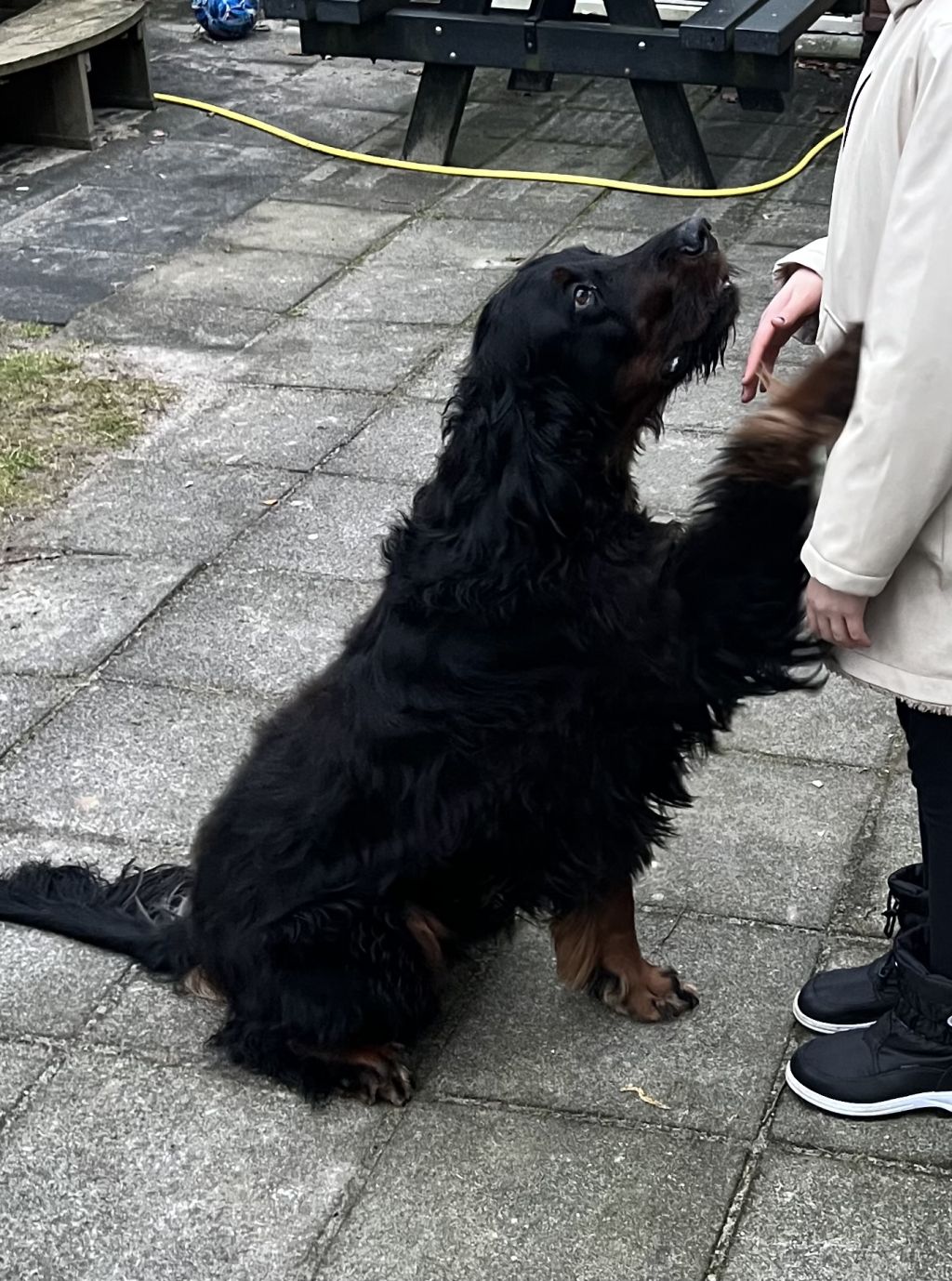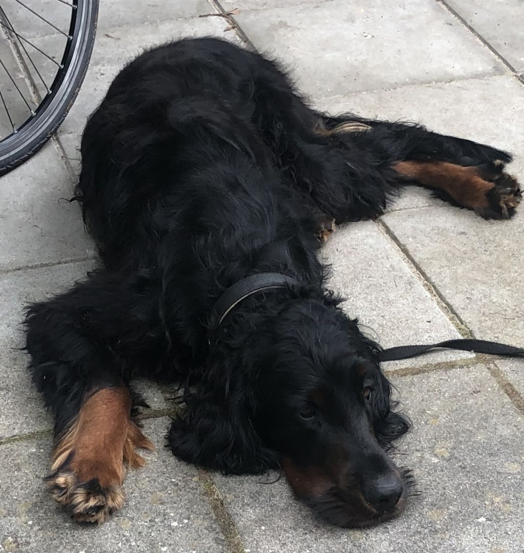 Mijn ouders hebben Scott, een enthousiaste, blije, sterke en beweeglijke hond. Het is een mooie Gordon Setter en is graag buiten. Helaas is het niet meer mogelijk voor mijn ouders om hem de benodigde tijd te geven om buiten te zijn. Hij gaat wel geregeld maar kort en voor zijn behoefte. Het lukt mijn ouders fysiek niet meer om hem meer te bieden.  Scott is graag buiten, maar loopt wel altijd aan de lijn.