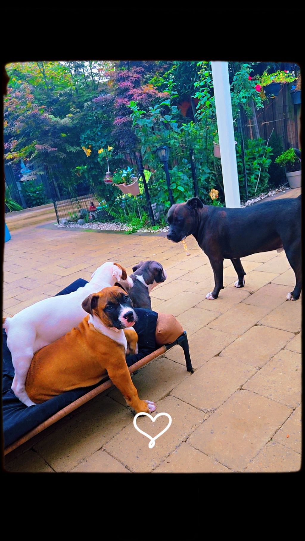 mijn volwassen reu Shiro (Stafford mix 4 jaar) en drie pups (Griselda, Keyra en Yuki, geboren 23 april 2025).