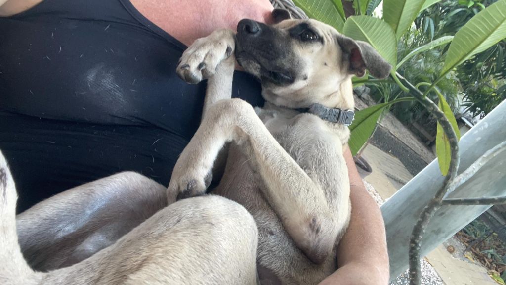 Kali houdt vanwege haar leeftijd vooral van korte wandelingen, knuffelen en dutjes doen.